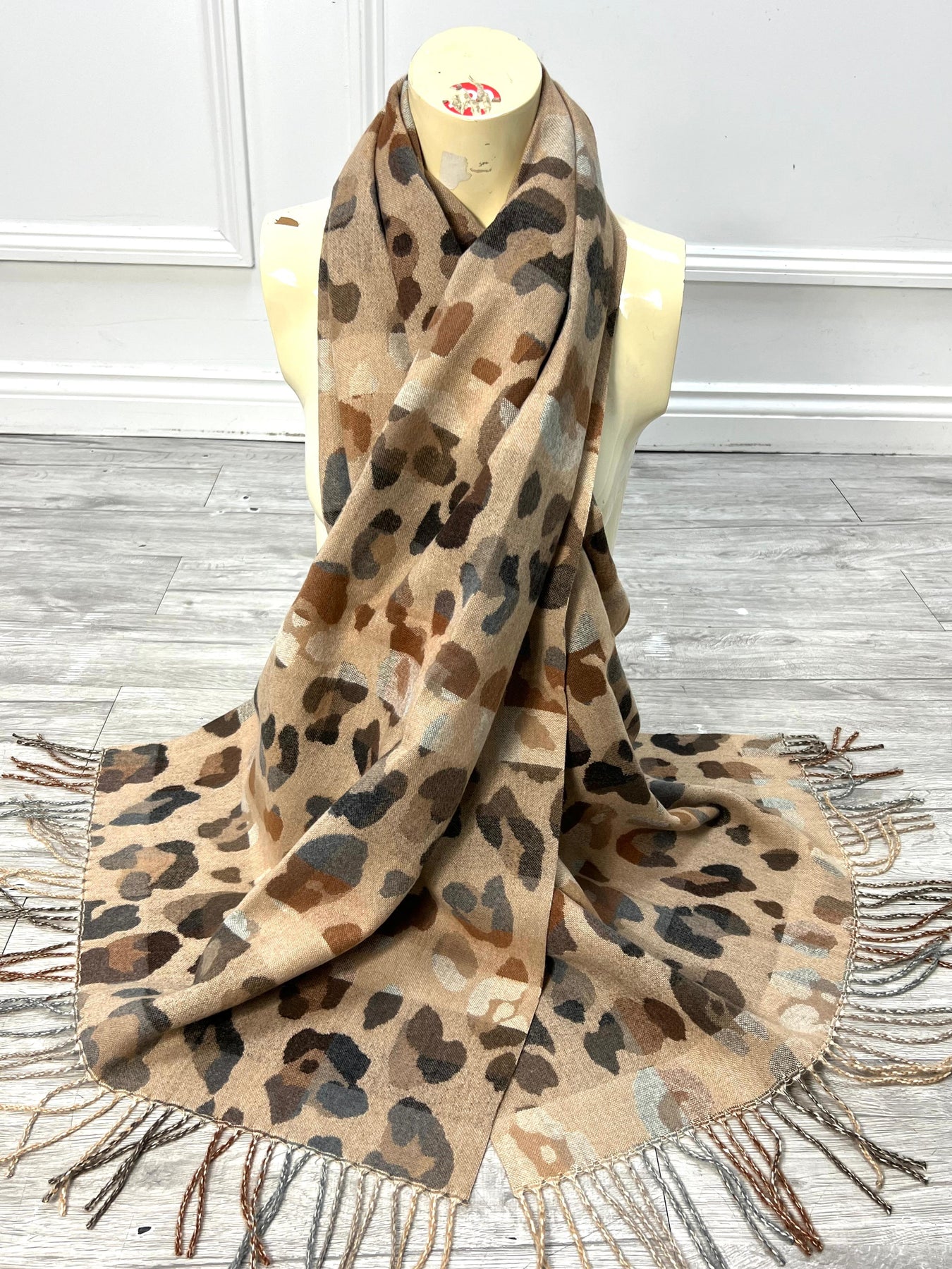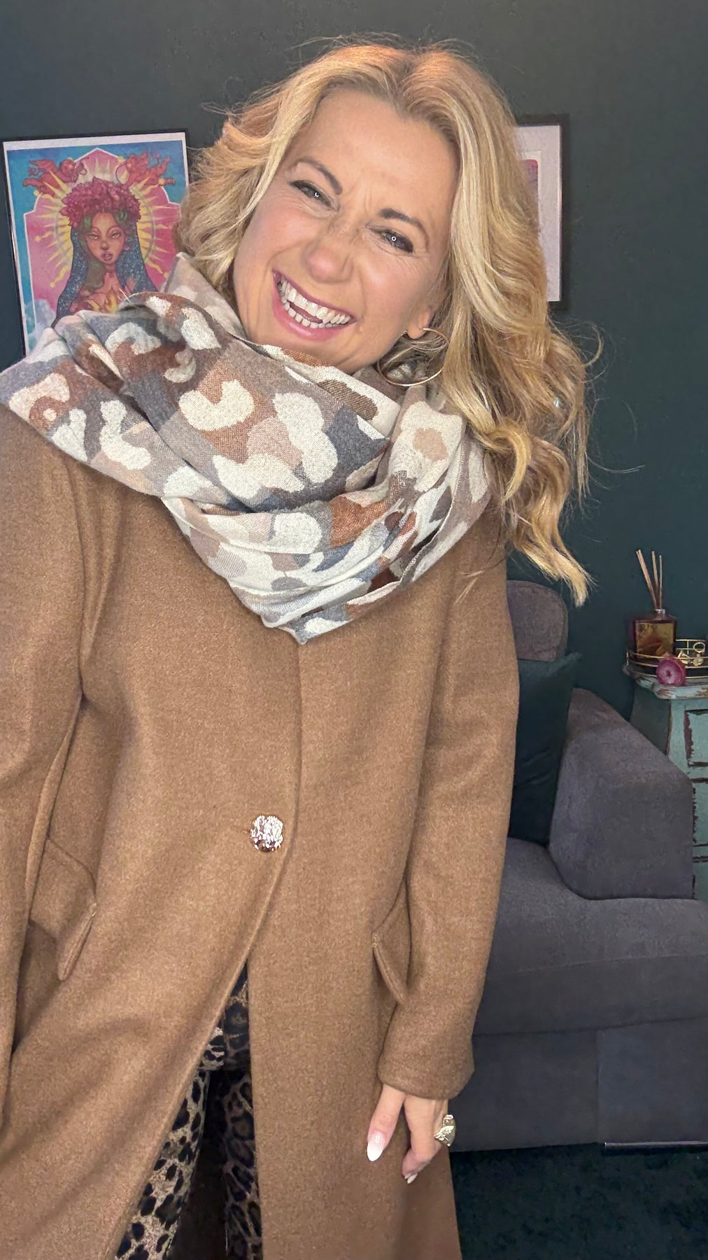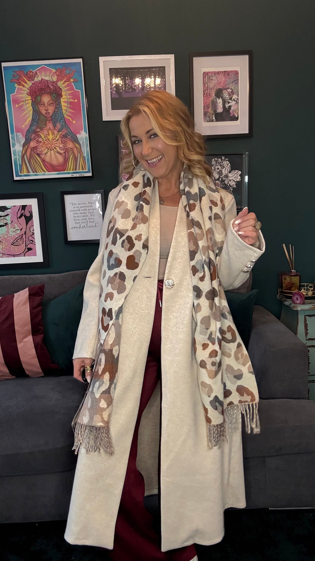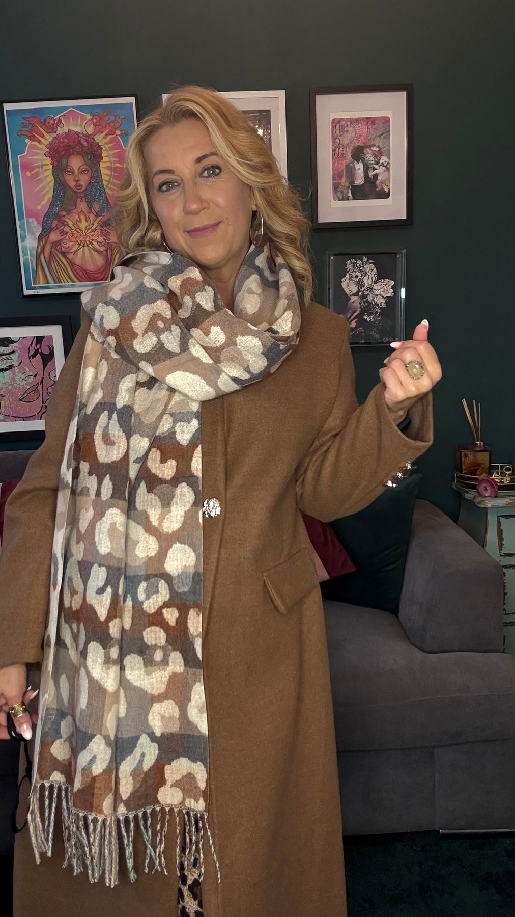 Gorgeous leopard beige scarf, perfect for those colder winter months and would look stunning with one of our long coats!